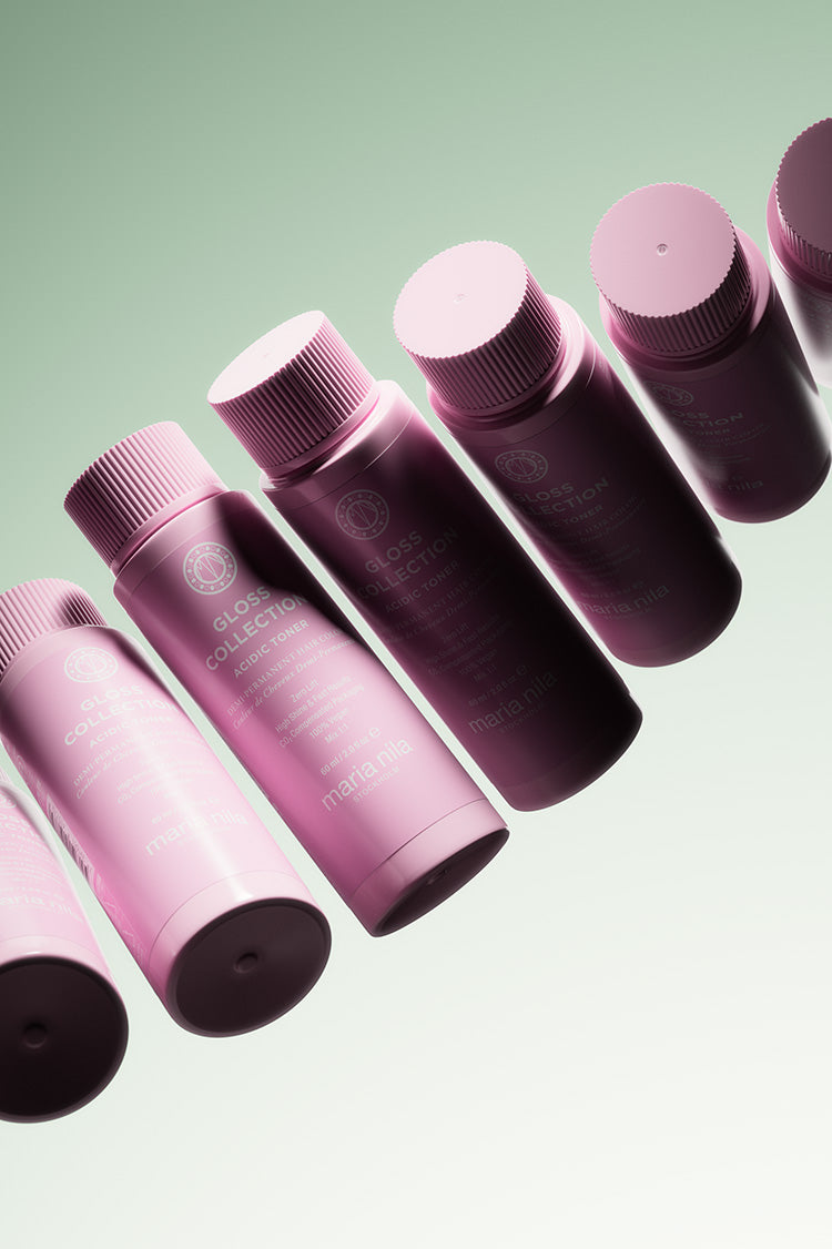 The Maria Nila Gloss Collection is a versatile color system with 60 intermixable and customizable shades, divided in 5 different color families.